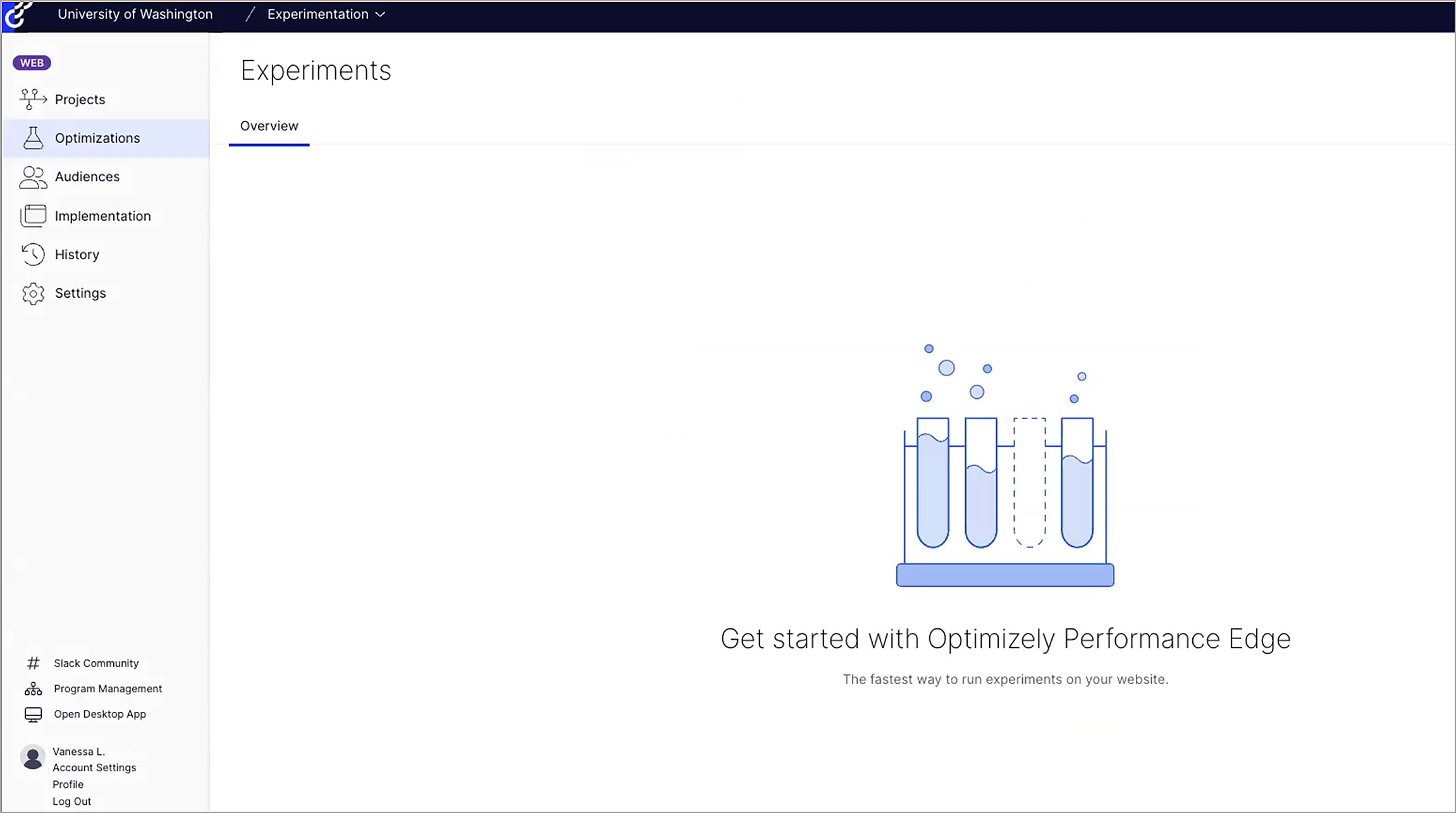 What new users see after creating their first “Project” on the Web Experimentation platform